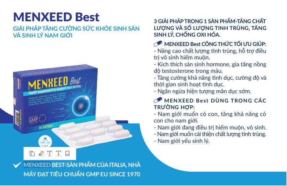 Caffeine và rượu bia, tập thể dục, giảm căng thẳng và một cách tiếp cận khác hiệu quả là tối ưu hóa lượng tinh trùng, một yếu tố quan trọng trong quá trình thụ thai. Menxeed best được chứng minh lâm sàng cung cấp các thành phần dinh dưỡng quan trọng để có được chất lượng tinh trùng tối ưu.