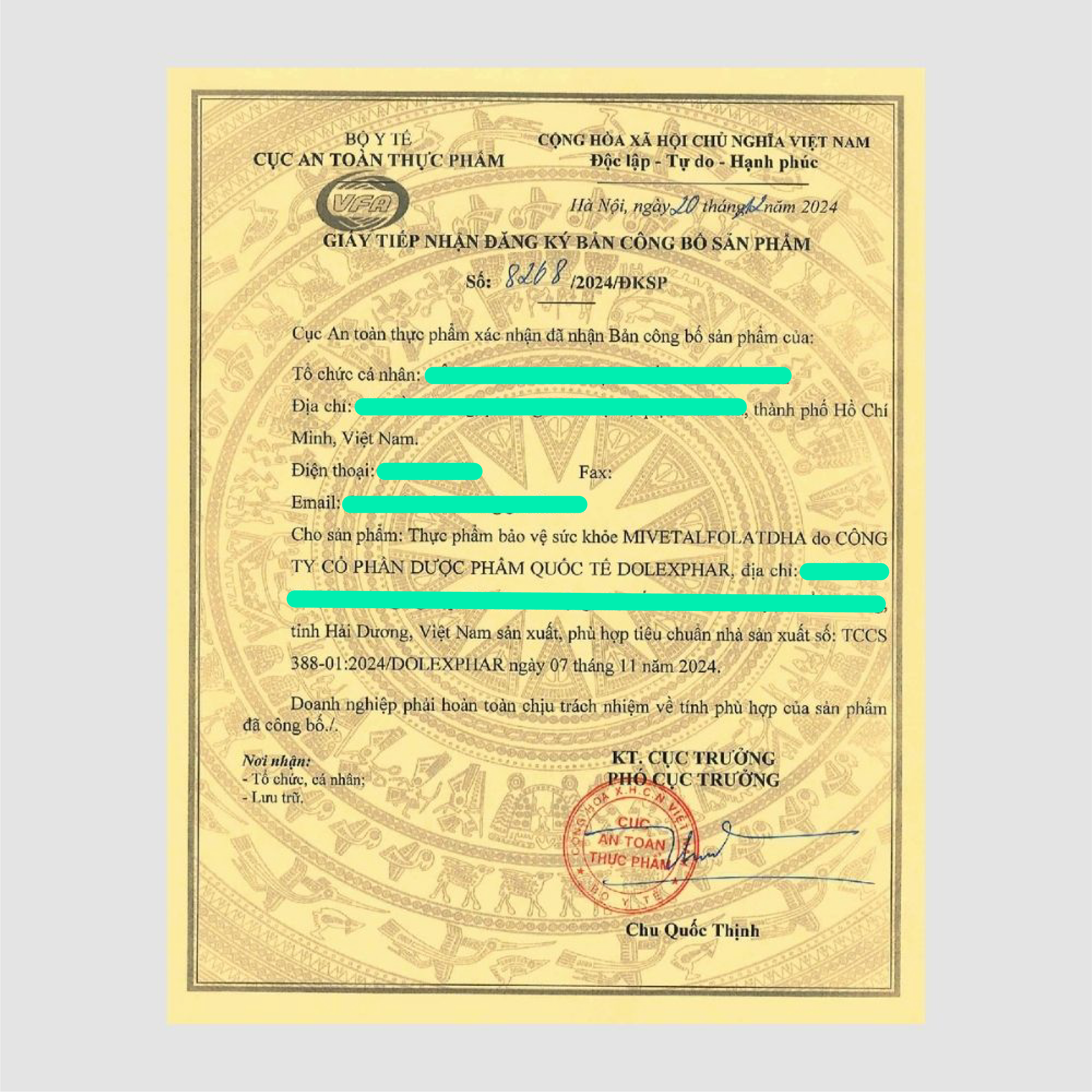 Mivetalfolate DHA bổ sung (6S)-5-MTHF (Acid folic dạng hoạt tính), sắt và các vitamin, khoáng chất cần thiết cho phụ nữ chuẩn bị mang thai, đang mang thai và cho con bú. Hỗ trợ tăng cường sức khỏe, nâng cao sức đề kháng, giảm nguy cơ thiếu hụt vitamin và khoáng chất, hỗ trợ thai kỳ khỏe mạnh.